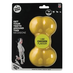 It’s triple the fun and very knobbly. It’s our incredibly yummy Trio Bone. Like all of our nylon chews, this TastyBone product has been tested on the most vigorous of chewers. Made from 100% virgin nylon, it is guaranteed to last. Uniquely infused with irresistible flavours right through to the core, your dog will never get bored, as the flavour will last for the lifetime of the bone. With every bite your dogs gums and teeth become stronger and healthier, protecting against infections, tooth loss and vets fees. This bone has a lip-smackingly delicious beef flavour and is designed for toy, small, medium, and large dogs.