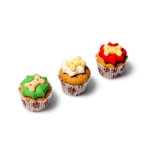 A bite sized Trio of festive mini-iced Woofins cupcake treats, two vanilla and one carob sponge each decorated with a dash of our famous yuletide yoghurt topping and finished with a crunchy bone biscuit.