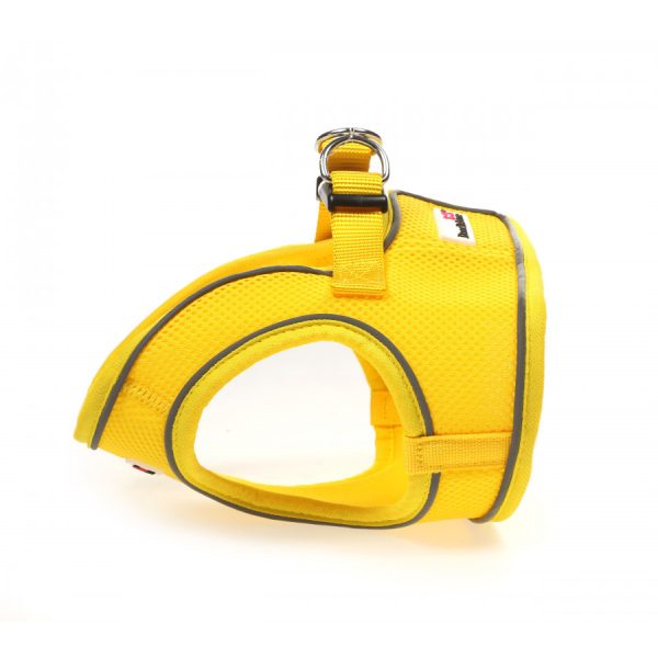 Our Snappy is constructed with soft mesh fabric that is breathable and a little bit stretchy. The harness gives a body-hugging fit with added chest coverage to avoid adding pressure to a particular part of the dogs body.