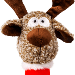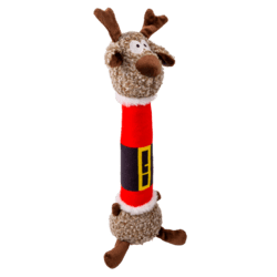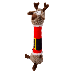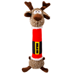 This long, skinny reindeer’s the ideal shape for thrashing fun—and sliding down chimneys! Low-tone squeaker prolongs play, holiday sweater brightens the fun.